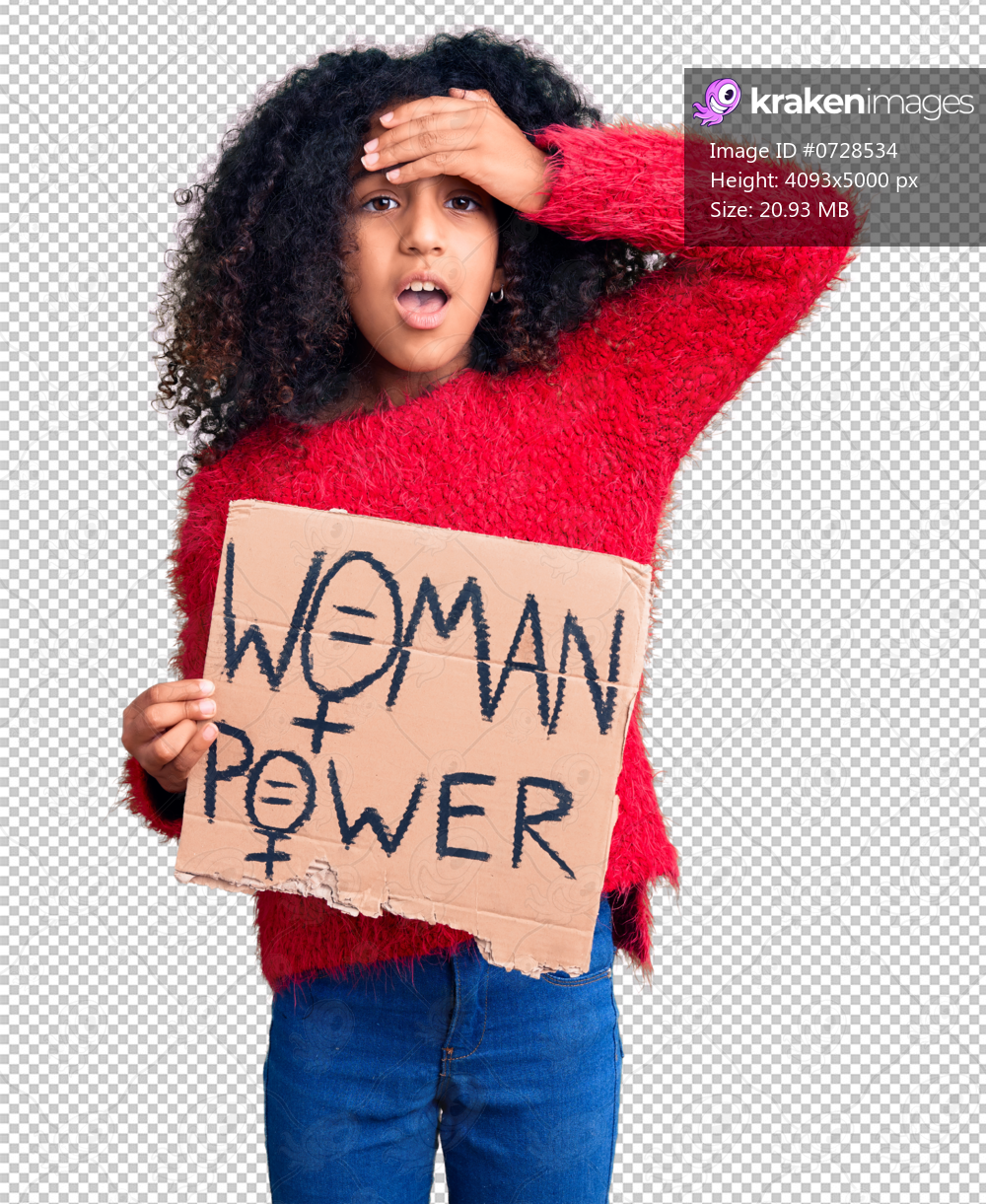 African american child with curly hair holding woman power banner stressed and frustrated with hand on head, surprised and angry face