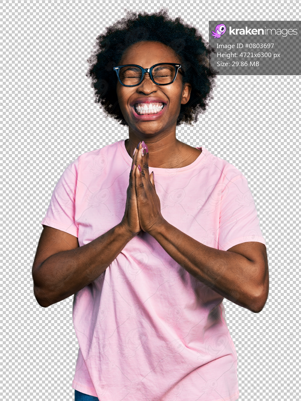 African american woman with afro hair wearing casual clothes and glasses begging and praying with hands together with hope expression on face very emotional and worried. begging. - Kraken Images