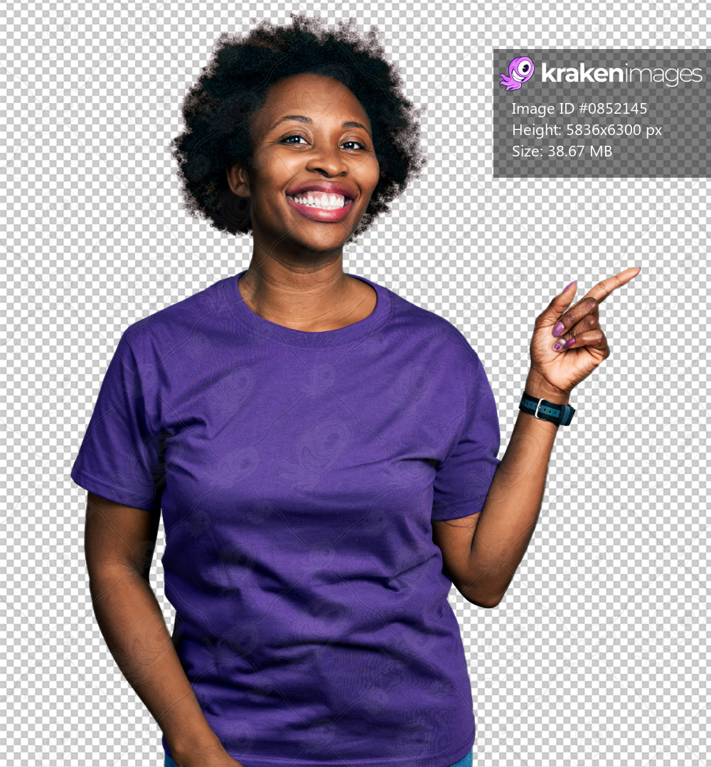 African american woman with afro hair wearing casual purple t shirt with a big smile on face, pointing with hand finger to the side looking at the camera. - Kraken Images