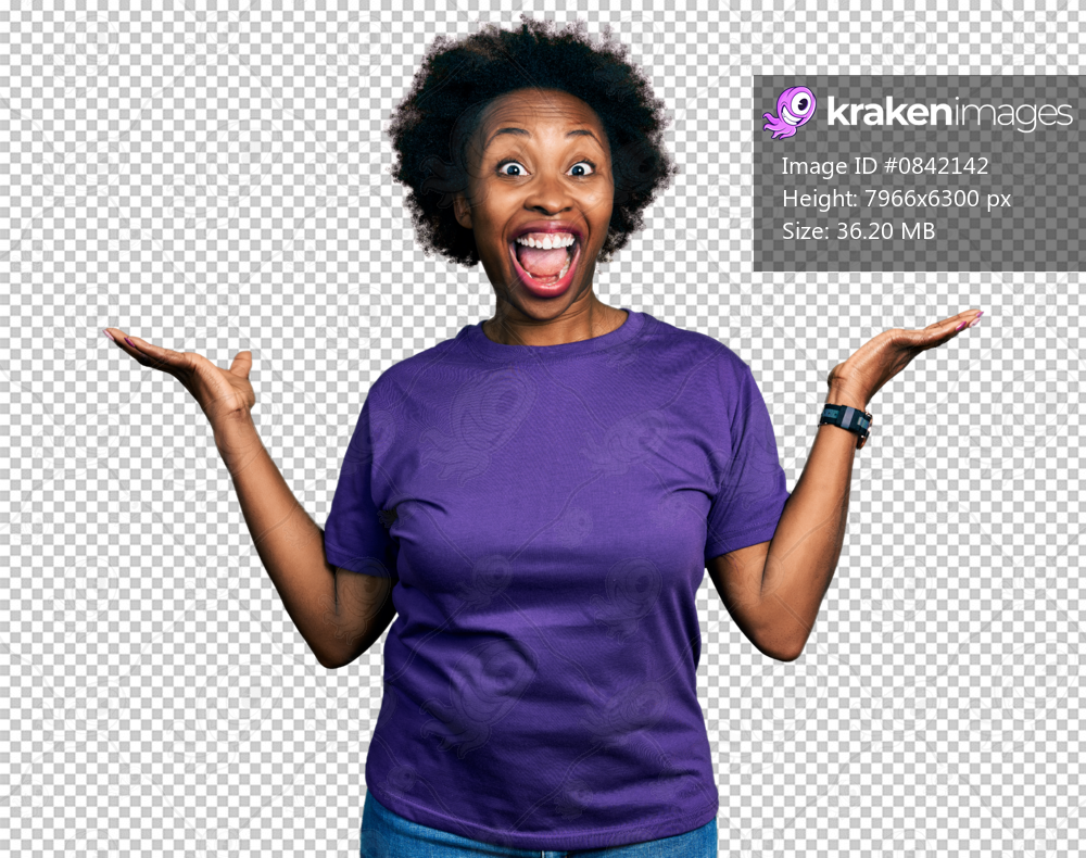 African american woman with afro hair wearing casual purple t shirt celebrating crazy and amazed for success with arms raised and open eyes screaming excited. winner concept - Kraken Images