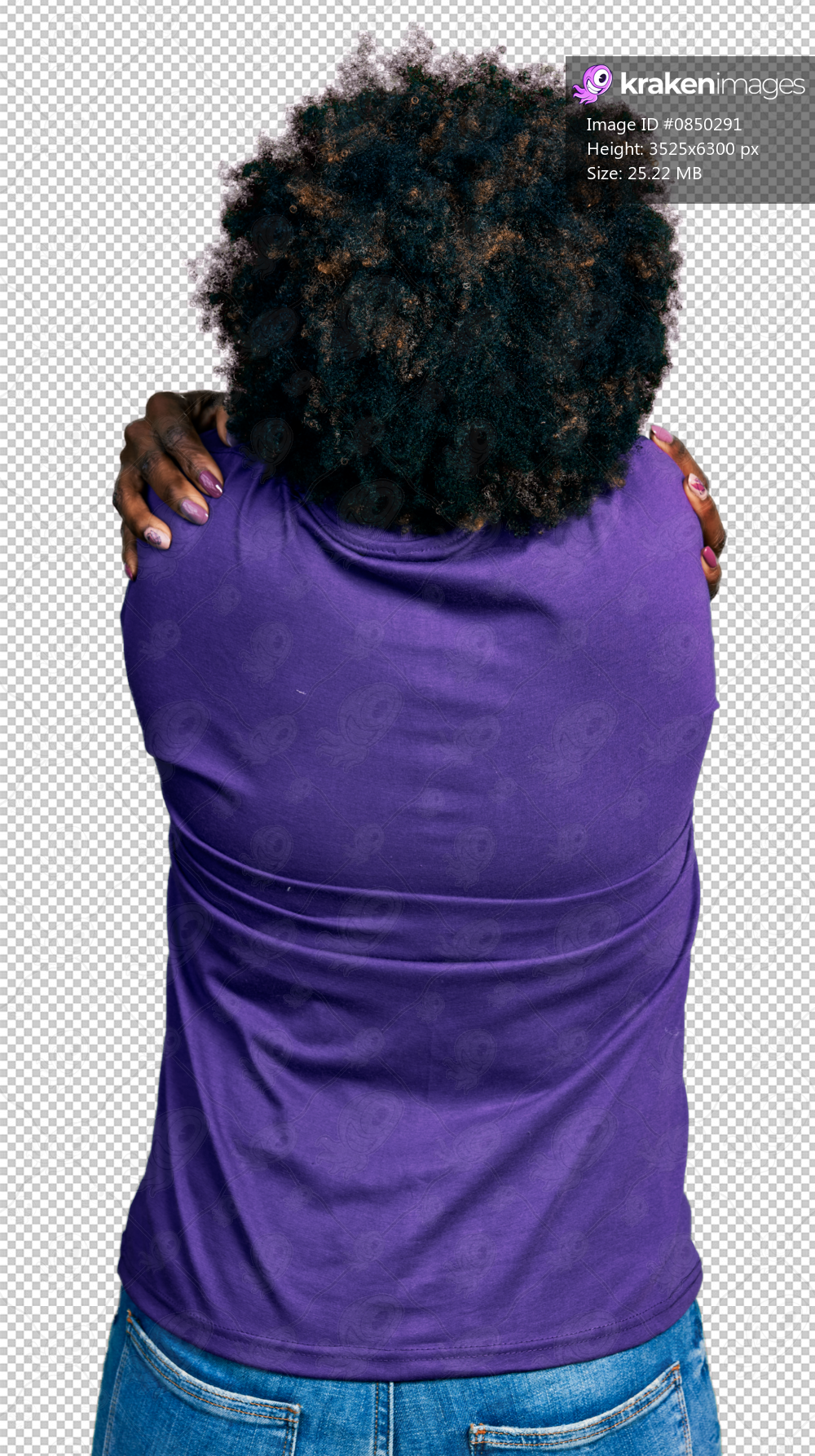 African american woman with afro hair wearing casual purple t shirt hugging oneself happy and positive from backwards. self love and self care