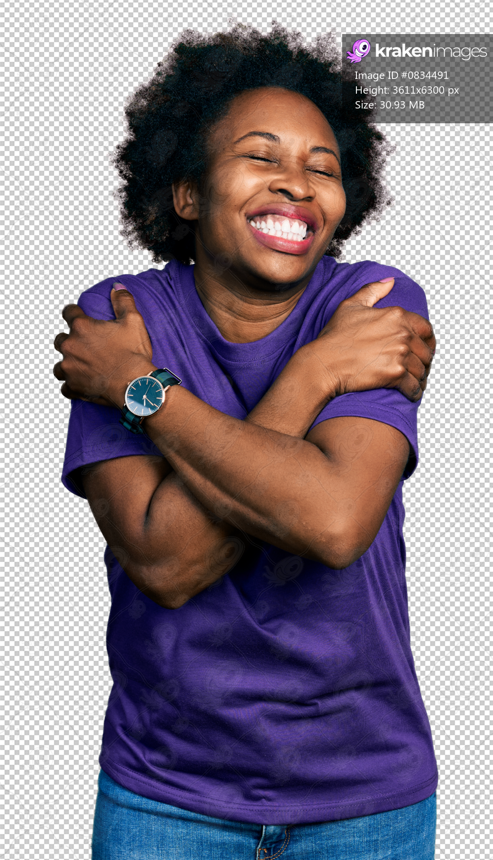 African american woman with afro hair wearing casual purple t shirt hugging oneself happy and positive, smiling confident. self love and self care