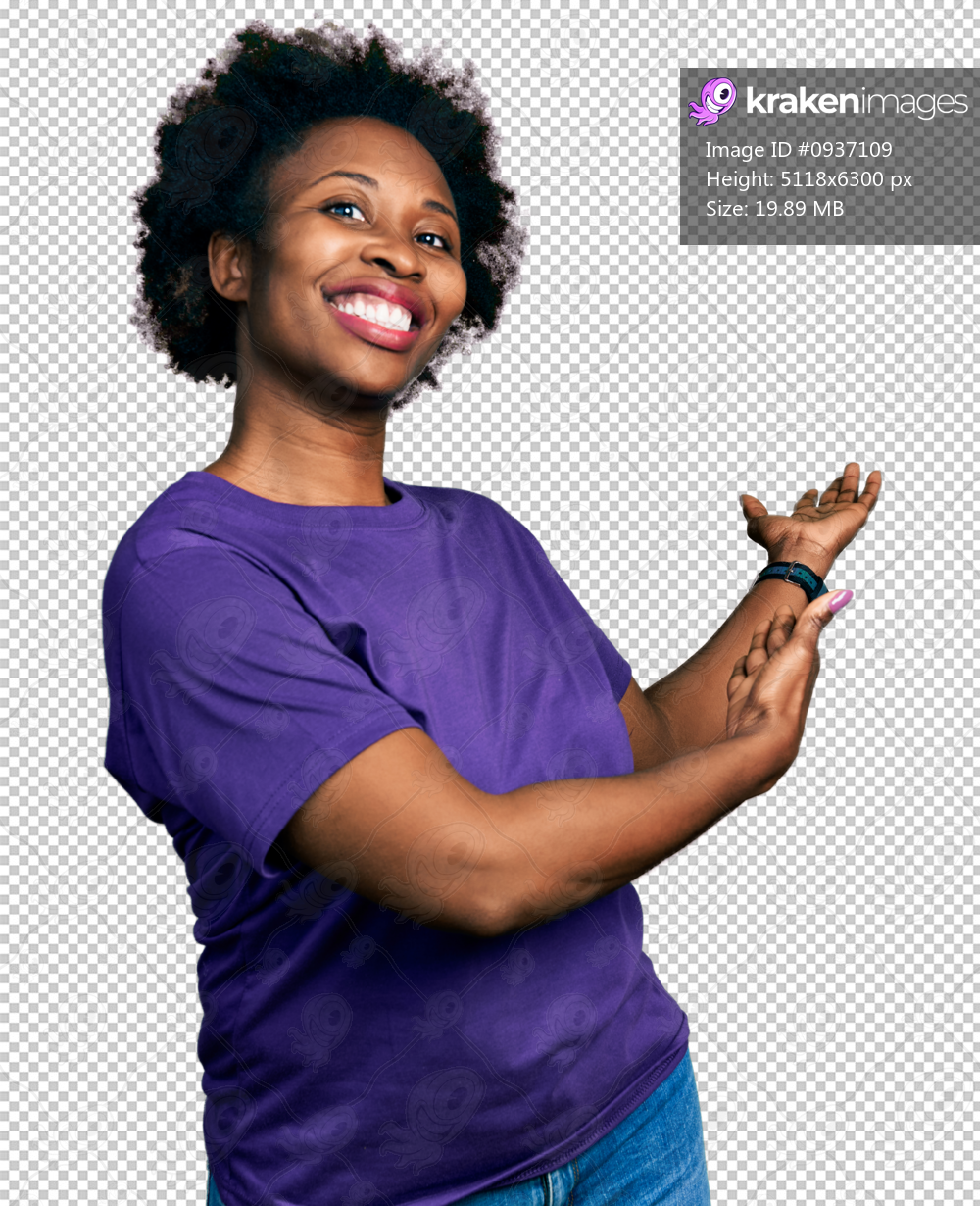 African american woman with afro hair wearing casual purple t shirt inviting to enter smiling natural with open hand