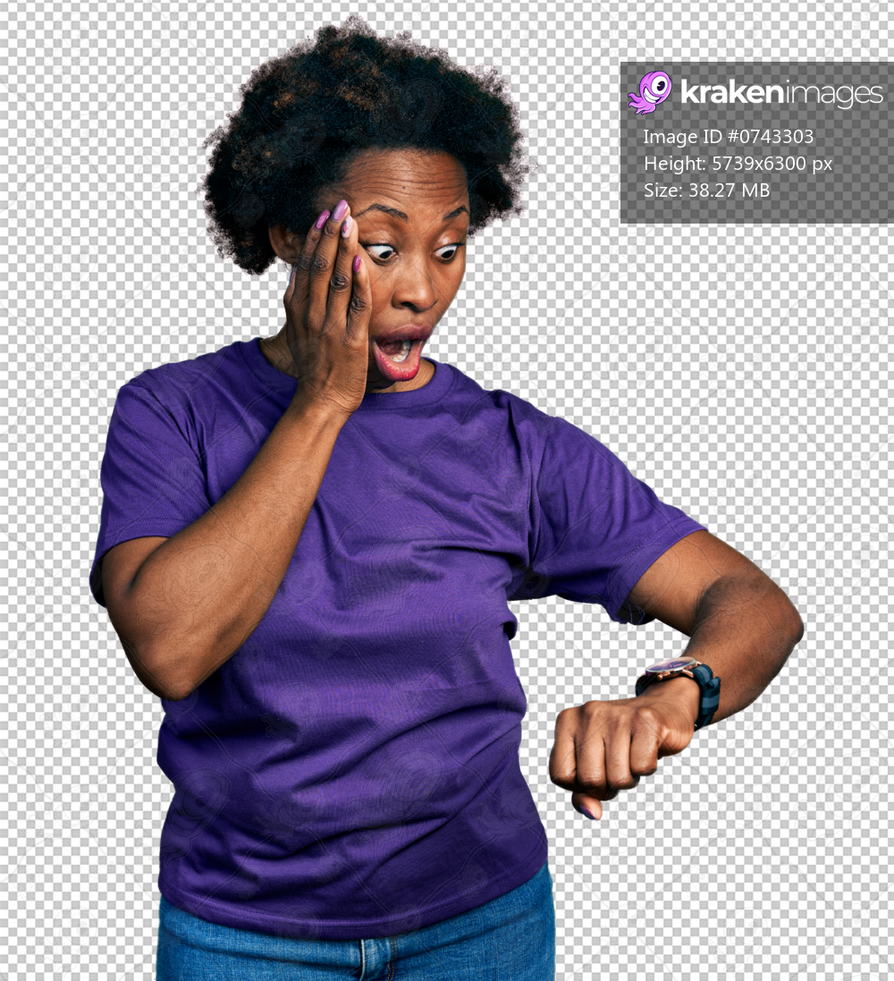 African american woman with afro hair wearing casual purple t shirt looking at the watch time worried, afraid of getting late