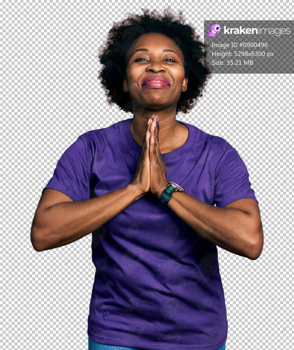 African american woman with afro hair wearing casual purple t shirt praying with hands together asking for forgiveness smiling confident.