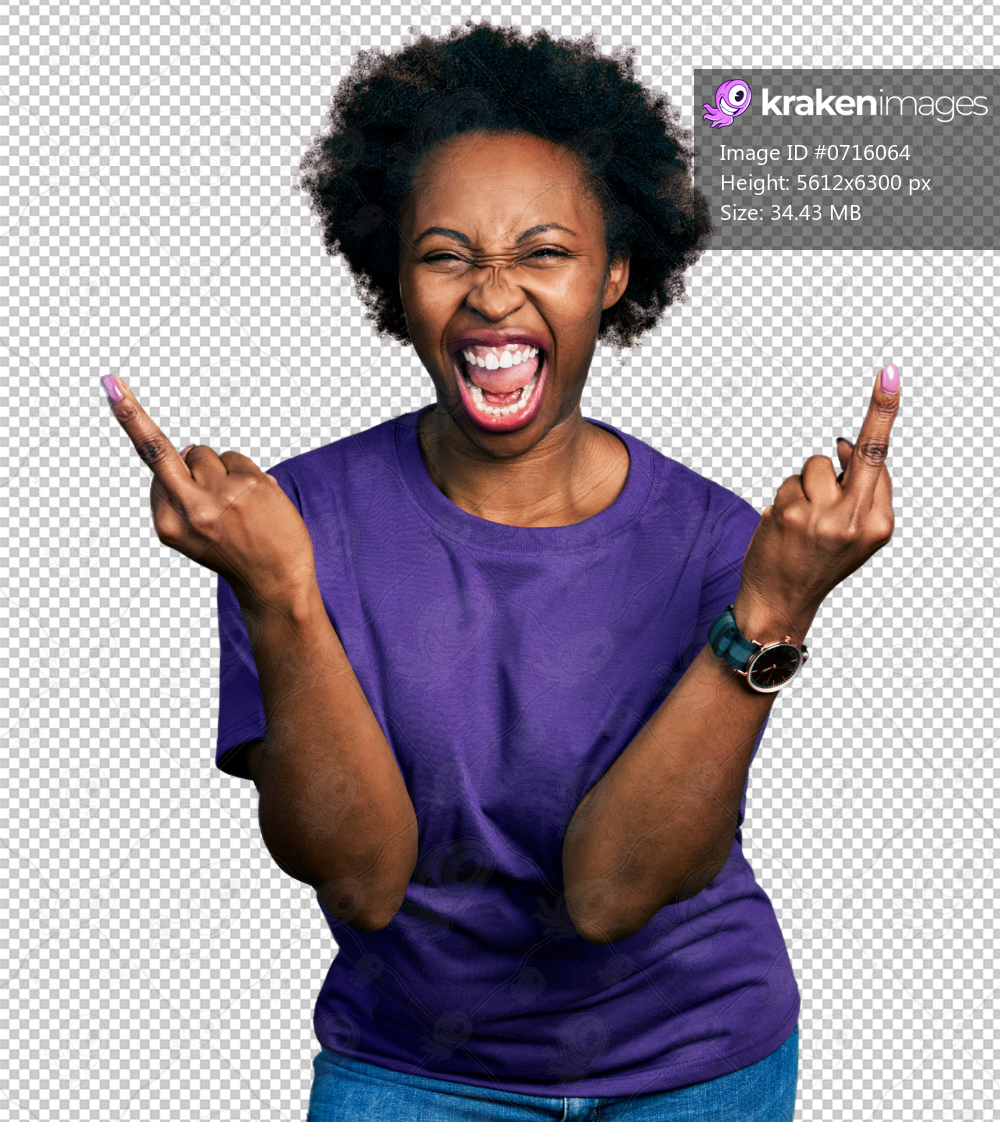 African american woman with afro hair wearing casual purple t shirt showing middle finger doing fuck you bad expression, provocation and rude attitude. screaming excited - Kraken Images