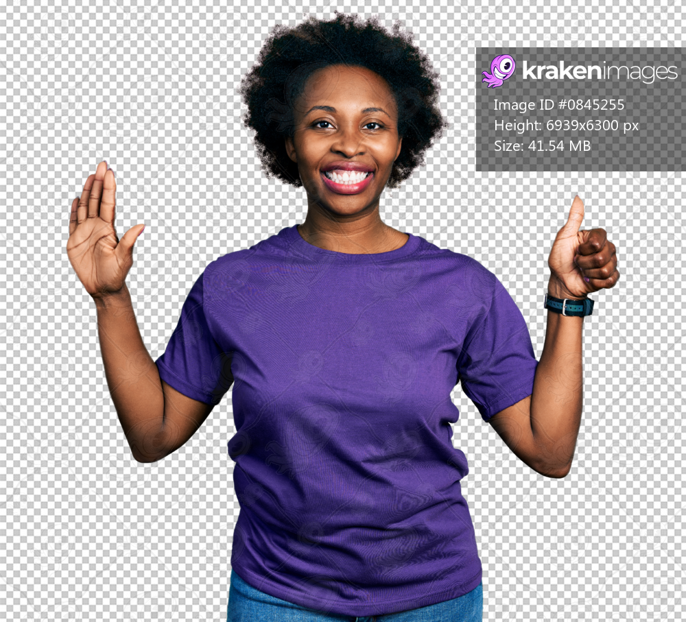 African american woman with afro hair wearing casual purple t shirt showing and pointing up with fingers number six while smiling confident and happy.