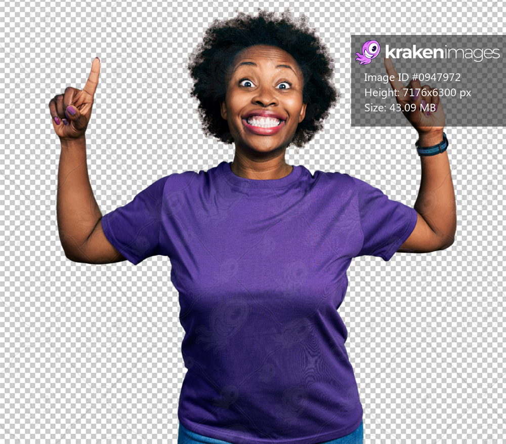 African american woman with afro hair wearing casual purple t shirt smiling amazed and surprised and pointing up with fingers and raised arms.