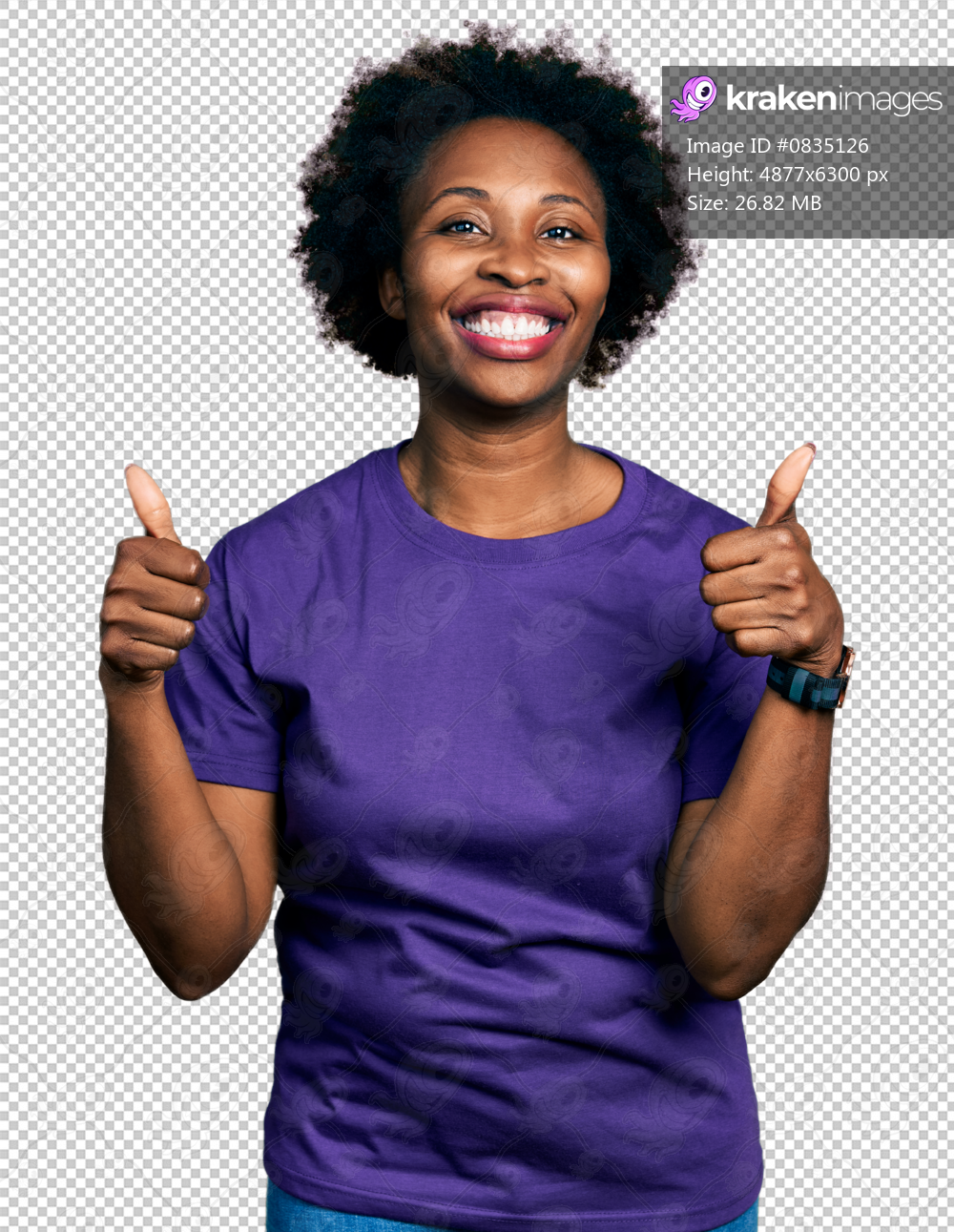 African american woman with afro hair wearing casual purple t shirt success sign doing positive gesture with hand, thumbs up smiling and happy. cheerful expression and winner gesture. - Kraken Images