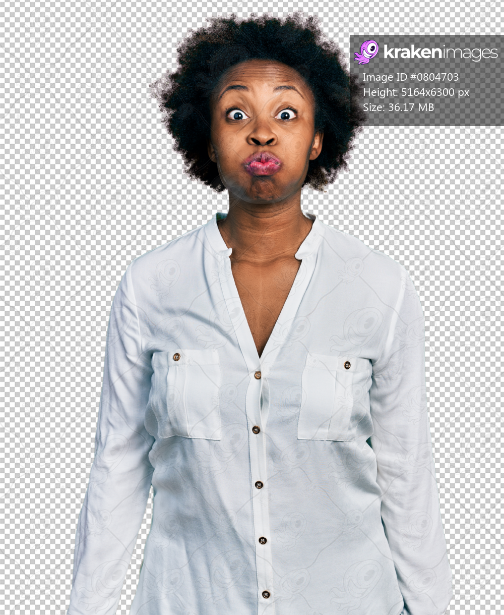 African american woman with afro hair wearing casual white t shirt puffing cheeks with funny face. mouth inflated with air, crazy expression.