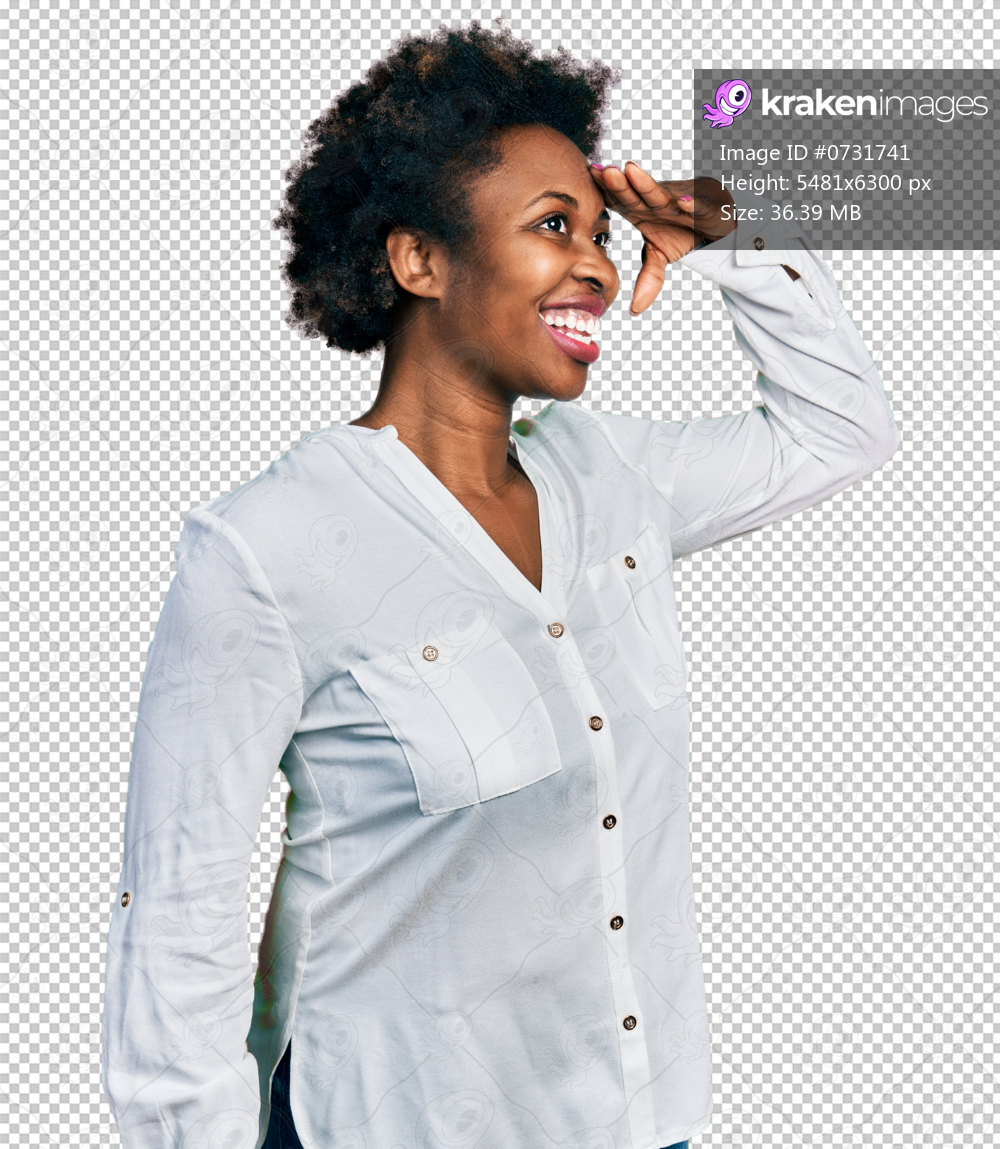 African american woman with afro hair wearing casual white t shirt very happy and smiling looking far away with hand over head. searching concept.