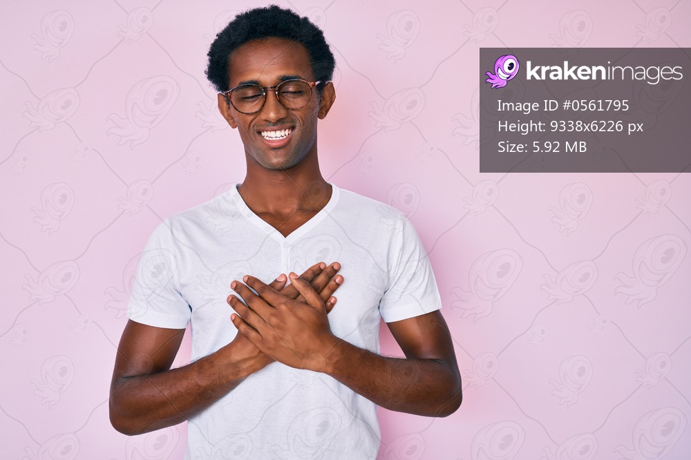 African handsome man wearing casual clothes and glasses smiling with hands on chest with closed eyes and grateful gesture on face. health concept.