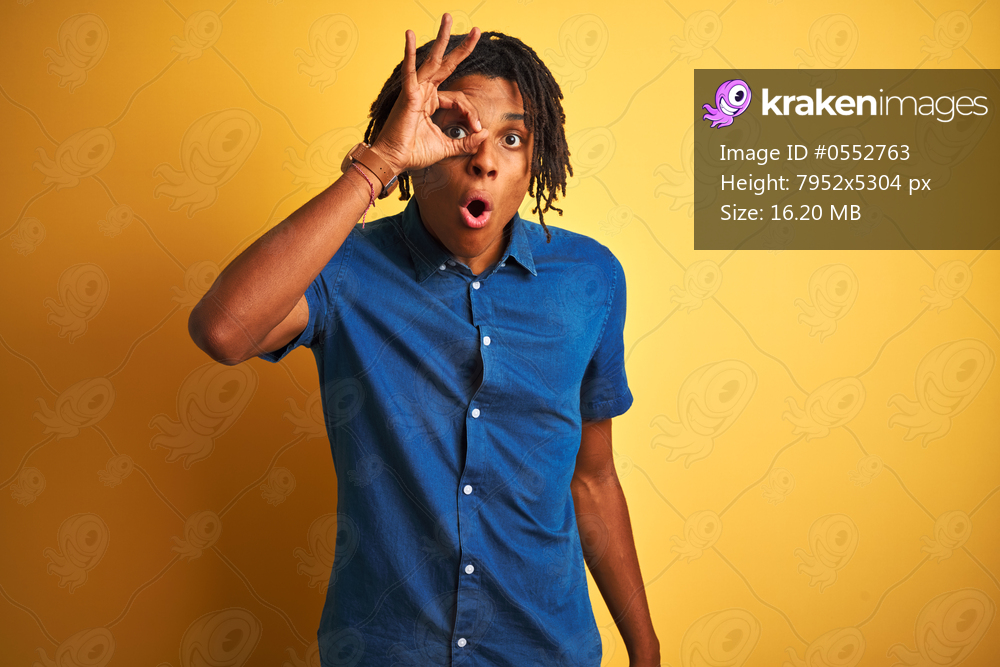 Afro man with dreadlocks wearing casual denim shirt standing over isolated yellow background doing ok gesture shocked with surprised face, eye looking through fingers. Unbelieving expression. - Kraken Images