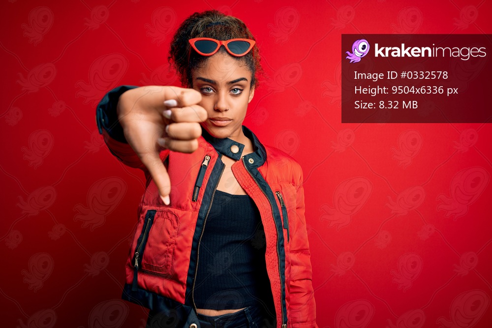 Beautiful african american girl wearing red jacket and sunglasses over isolated background looking unhappy and angry showing rejection and negative with thumbs down gesture. Bad expression. - Kraken Images