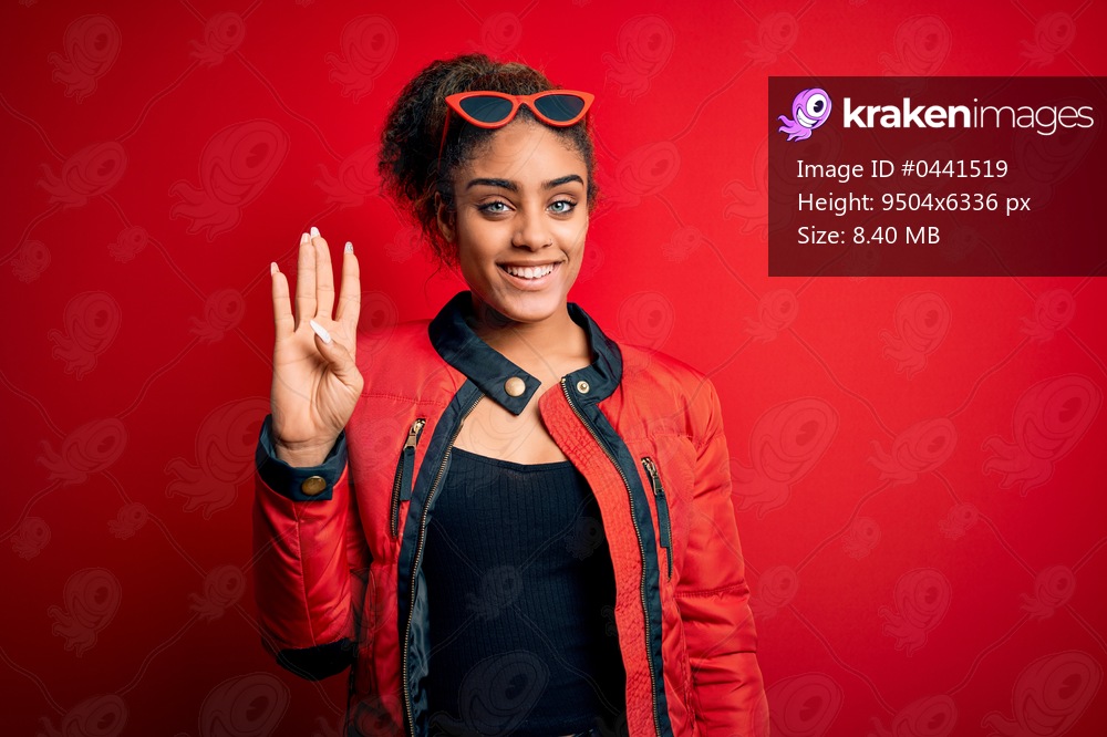 Beautiful african american girl wearing red jacket and sunglasses over isolated background showing and pointing up with fingers number four while smiling confident and happy. - Kraken Images