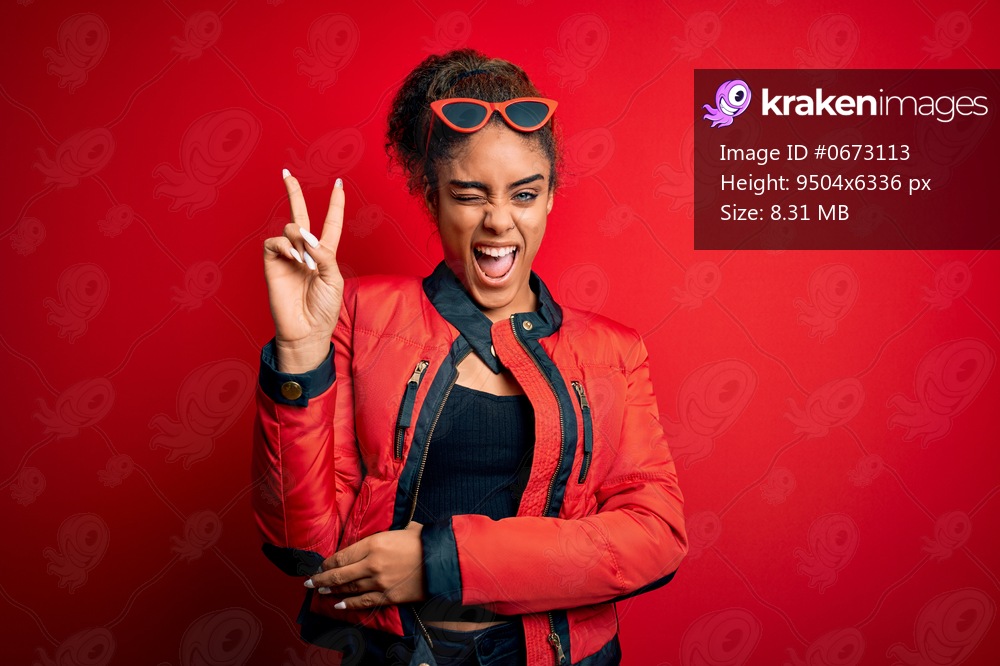 Beautiful african american girl wearing red jacket and sunglasses over isolated background smiling with happy face winking at the camera doing victory sign. Number two. - Kraken Images