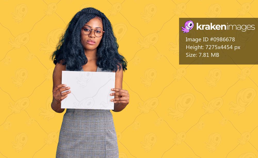 Beautiful african american woman holding blank empty banner thinking attitude and sober expression looking self confident