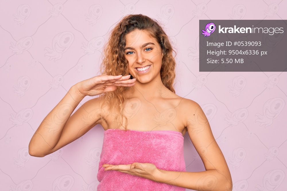 Beautiful blonde woman with blue eyes wearing towel shower after bath over pink background gesturing with hands showing big and large size sign, measure symbol. Smiling looking at the camera. Measuring concept. - Kraken Images