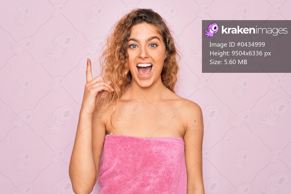 Beautiful blonde woman with blue eyes wearing towel shower after bath over pink background pointing finger up with successful idea. Exited and happy. Number one. - Kraken Images