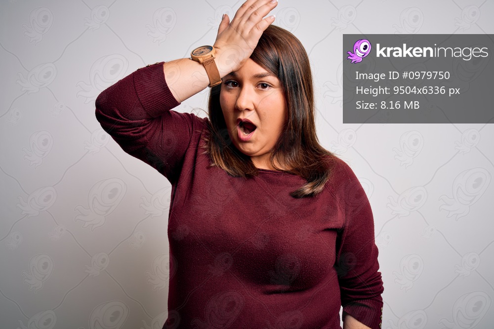 Beautiful brunette plus size woman wearing casual sweater over isolated white background surprised with hand on head for mistake, remember error. Forgot, bad memory concept. - Kraken Images