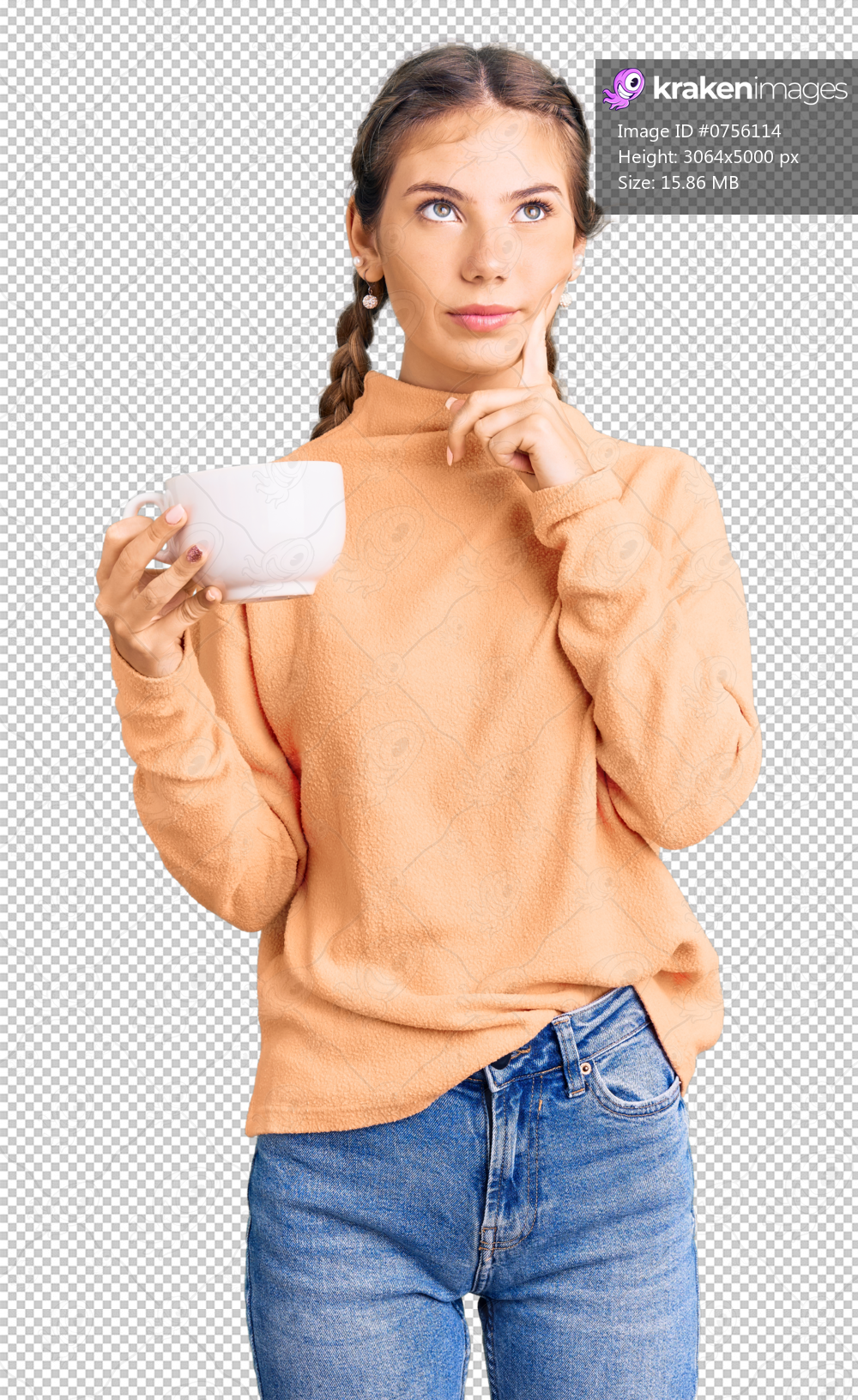 Beautiful caucasian woman with blonde hair drinking a coffee serious face thinking about question with hand on chin, thoughtful about confusing idea