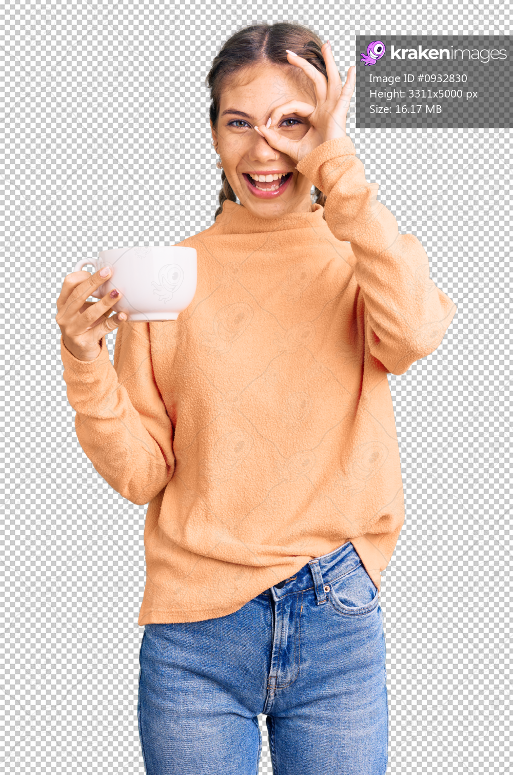 Beautiful caucasian woman with blonde hair drinking a coffee smiling happy doing ok sign with hand on eye looking through fingers
