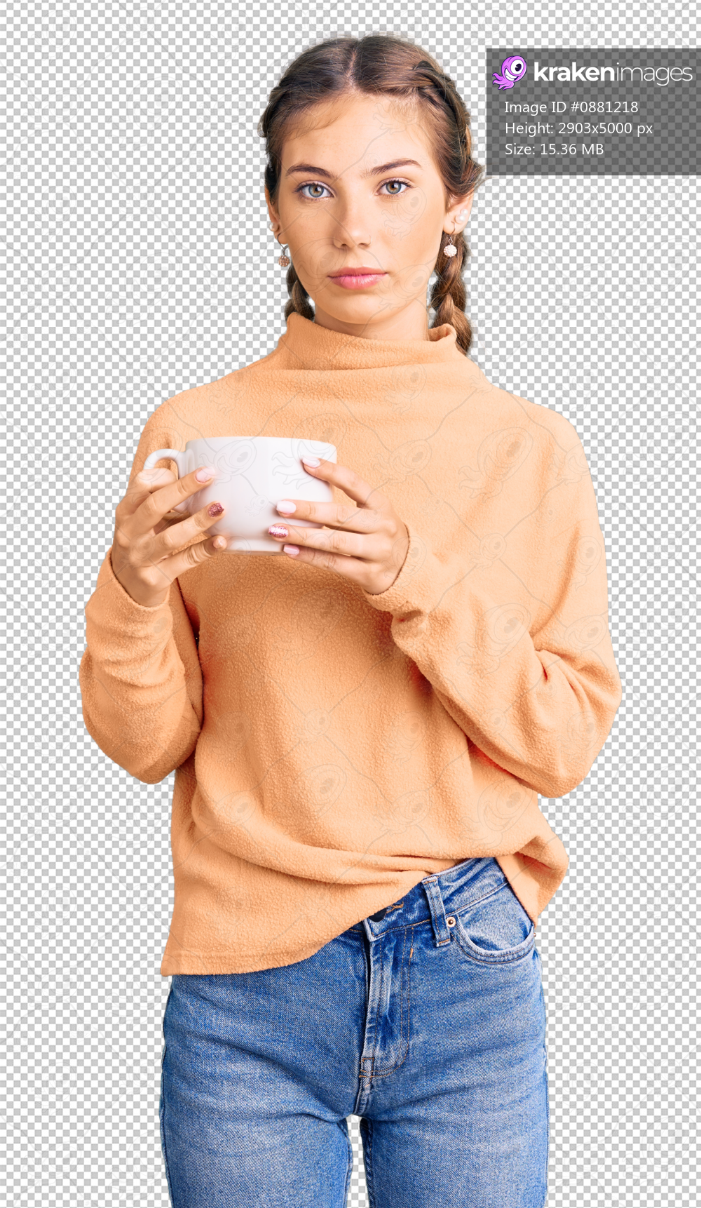 Beautiful caucasian woman with blonde hair drinking a coffee thinking attitude and sober expression looking self confident