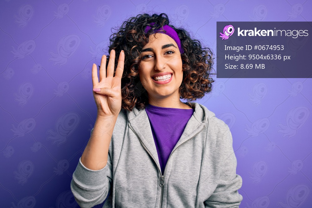 Beautiful curly arab sportswoman doing sport wearing sportswear over purple background showing and pointing up with fingers number four while smiling confident and happy. - Kraken Images