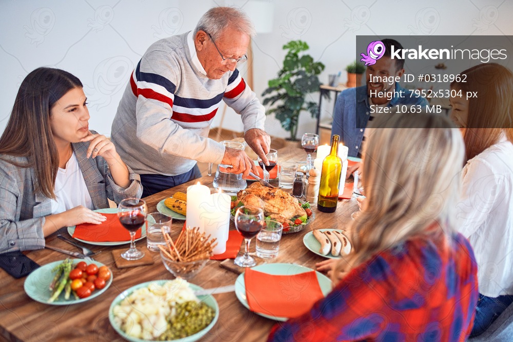 Beautiful family meeting smiling happy and confident. Carving roasted turkey celebrating Christmas at home