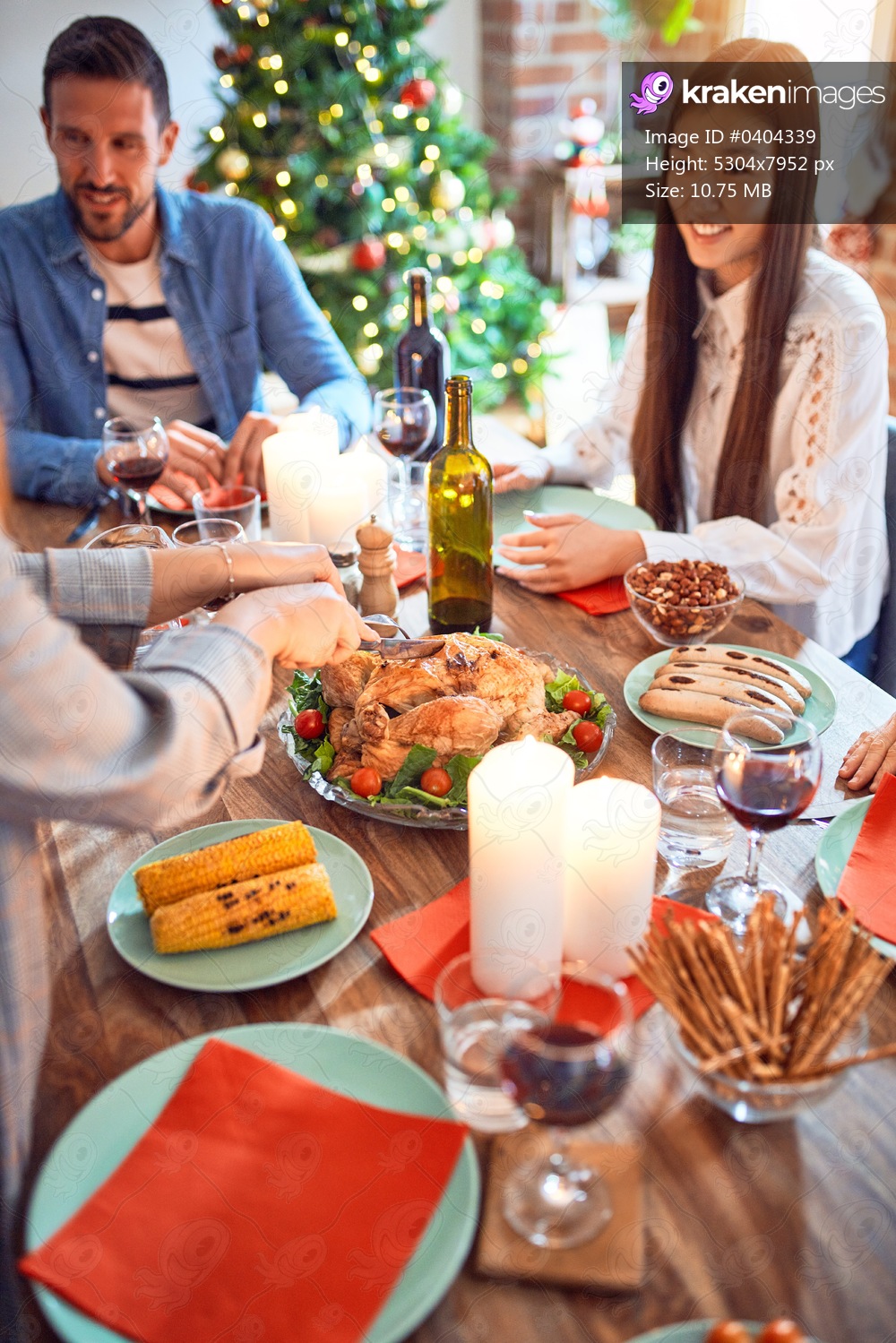 Beautiful family meeting smiling happy and confident. Carving roasted turkey celebrating Christmas at home