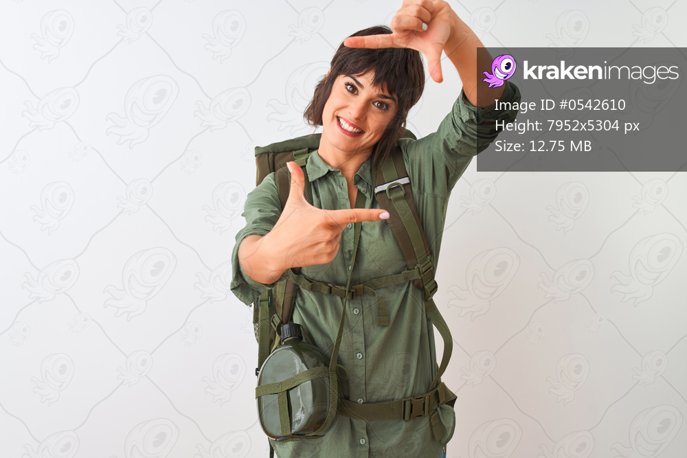 Beautiful hiker woman wearing backpack and water canteen over isolated white background smiling making frame with hands and fingers with happy face. Creativity and photography concept. - Kraken Images