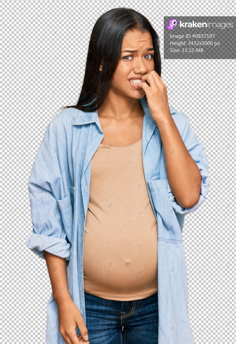 Beautiful hispanic woman expecting a baby showing pregnant belly looking stressed and nervous with hands on mouth biting nails. anxiety problem.