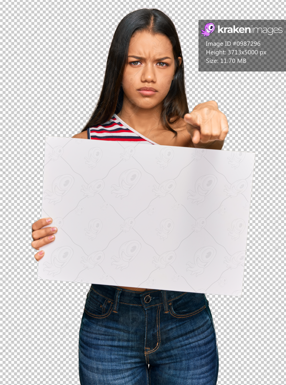 Beautiful hispanic woman holding blank empty banner pointing with finger to the camera and to you, confident gesture looking serious