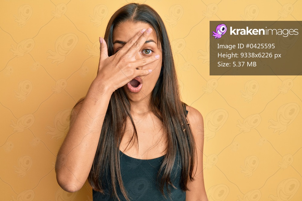 Beautiful hispanic woman wearing casual clothes peeking in shock covering face and eyes with hand, looking through fingers afraid