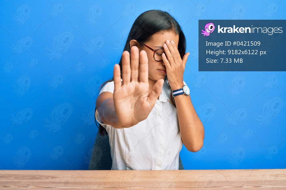 Beautiful hispanic woman wearing casual clothes sitting on the table covering eyes with hands and doing stop gesture with sad and fear expression. embarrassed and negative concept. - Kraken Images