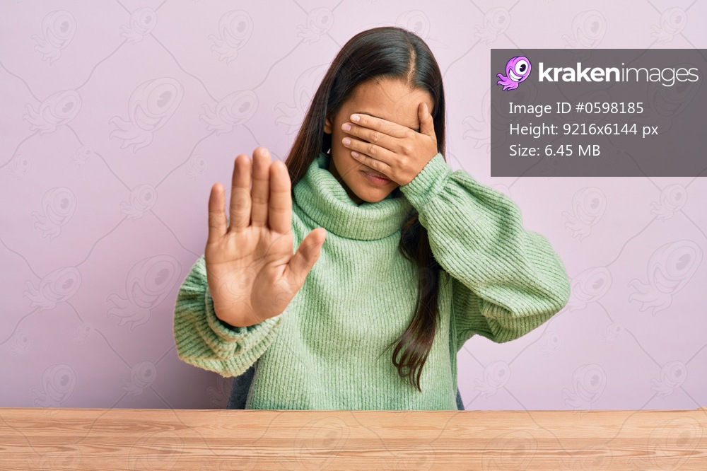 Beautiful hispanic woman wearing casual clothes sitting on the table covering eyes with hands and doing stop gesture with sad and fear expression. embarrassed and negative concept. - Kraken Images