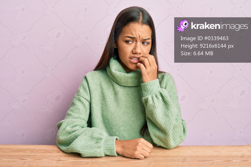 Beautiful hispanic woman wearing casual clothes sitting on the table looking stressed and nervous with hands on mouth biting nails. anxiety problem.