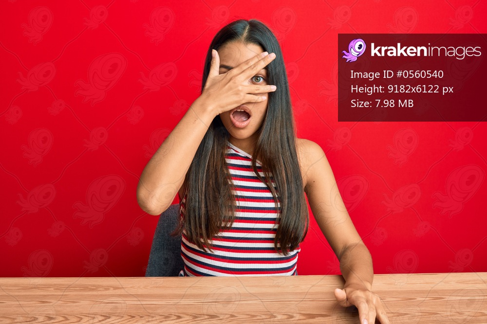 Beautiful hispanic woman wearing casual clothes sitting on the table peeking in shock covering face and eyes with hand, looking through fingers with embarrassed expression. - Kraken Images