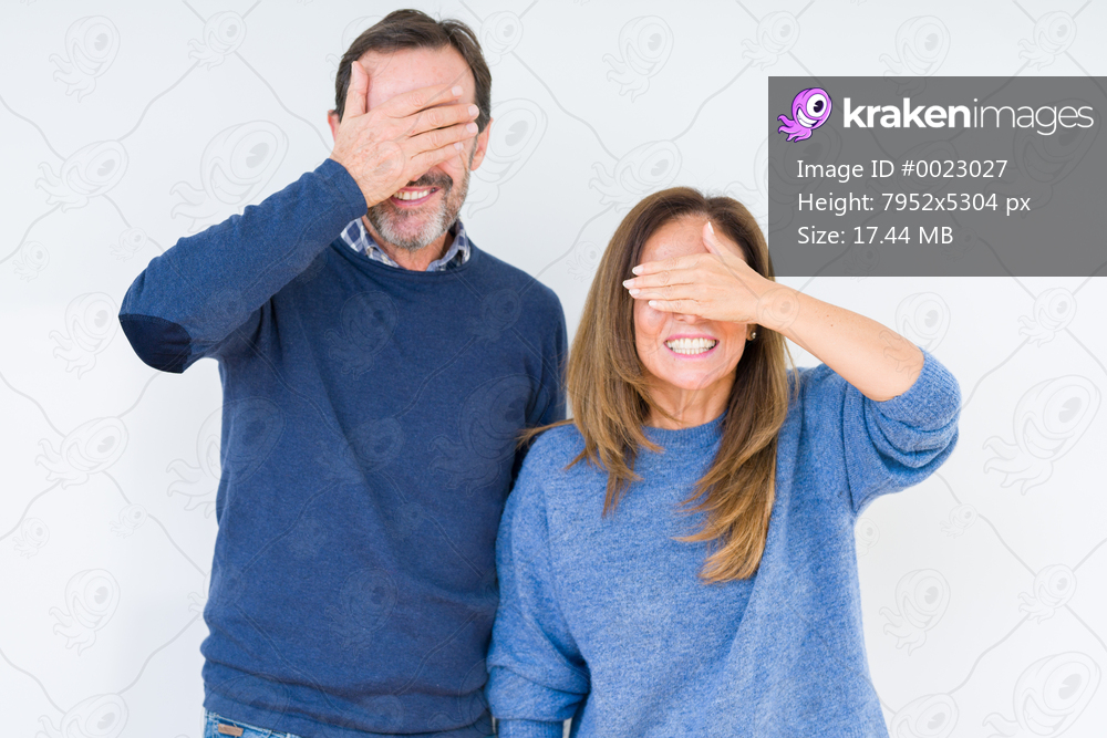 Beautiful middle age couple in love over isolated background smiling and laughing with hand on face covering eyes for surprise. Blind concept.