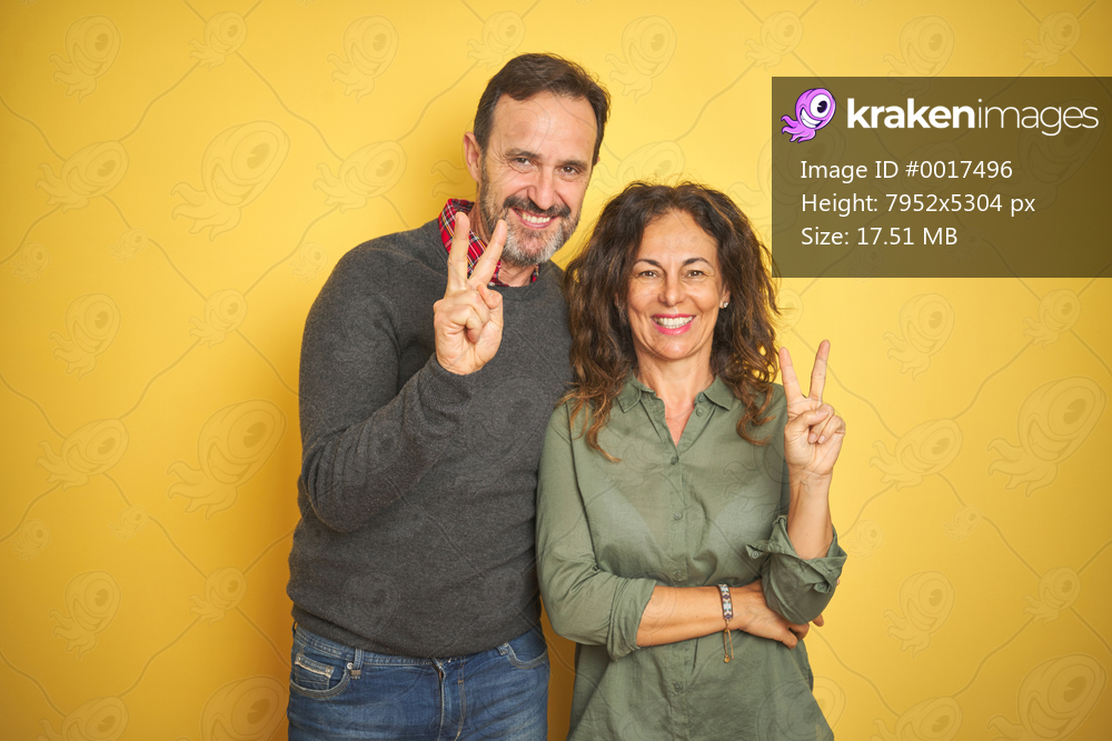 Beautiful middle age couple over isolated yellow background smiling with happy face winking at the camera doing victory sign. Number two.