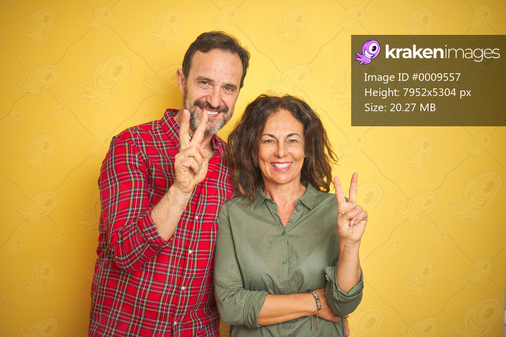 Beautiful middle age couple over isolated yellow background smiling with happy face winking at the camera doing victory sign. Number two.