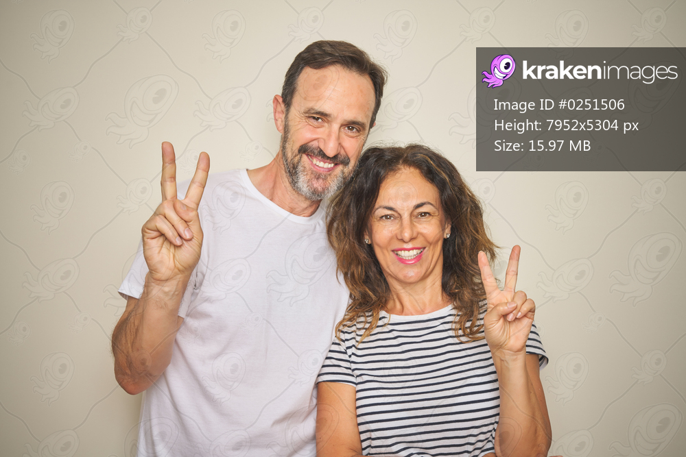 Beautiful middle age couple together standing over isolated white background smiling with happy face winking at the camera doing victory sign. Number two. - Kraken Images