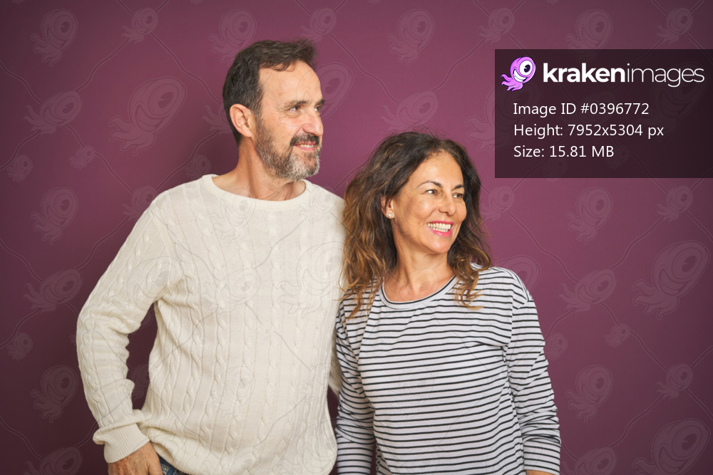 Beautiful middle age couple wearing winter sweater over isolated purple background looking away to side with smile on face, natural expression. Laughing confident. - Kraken Images