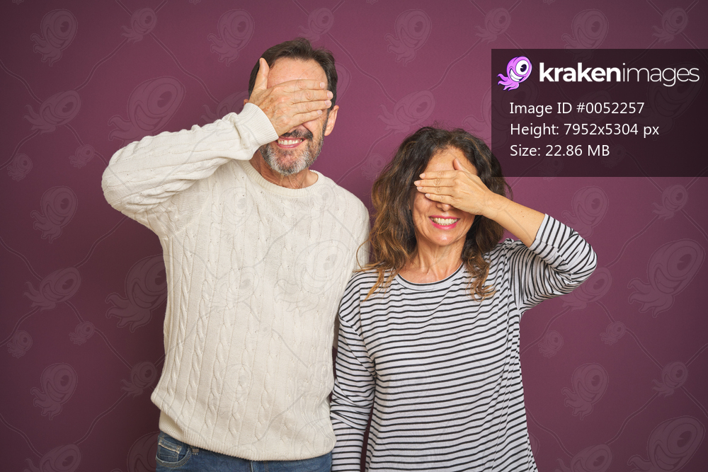 Beautiful middle age couple wearing winter sweater over isolated purple background smiling and laughing with hand on face covering eyes for surprise. Blind concept. - Kraken Images