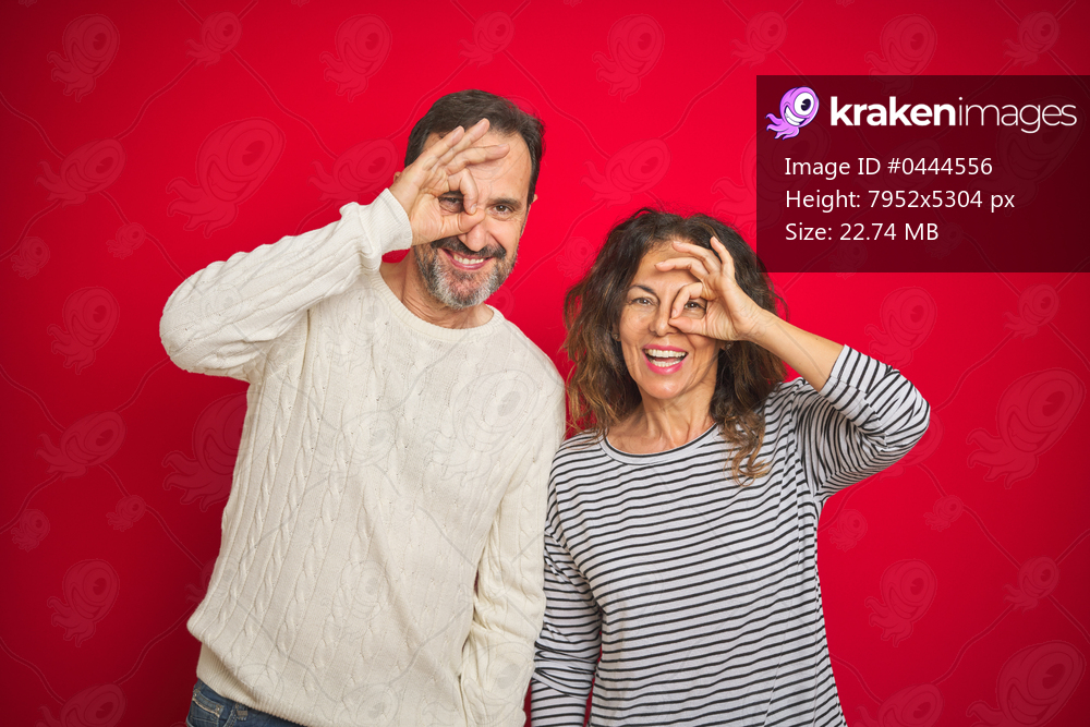 Beautiful middle age couple wearing winter sweater over isolated red background doing ok gesture with hand smiling, eye looking through fingers with happy face. - Kraken Images