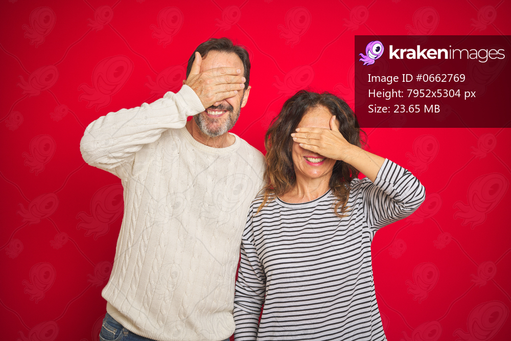 Beautiful middle age couple wearing winter sweater over isolated red background smiling and laughing with hand on face covering eyes for surprise. Blind concept. - Kraken Images