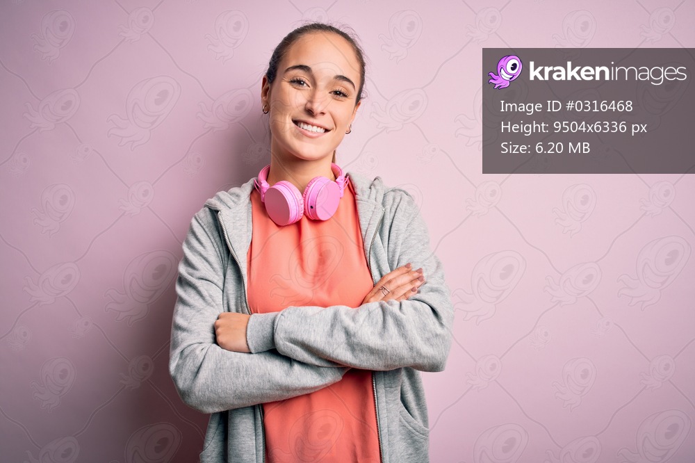 Beautiful sporty woman doing sport listening to music using headphones over pink background happy face smiling with crossed arms looking at the camera. Positive person. - Kraken Images