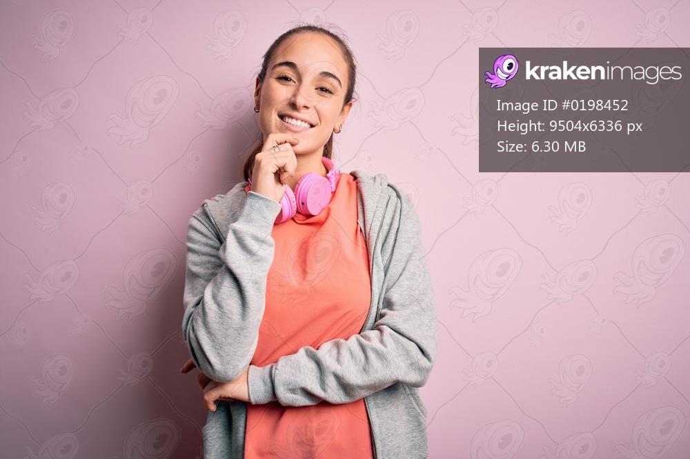 Beautiful sporty woman doing sport listening to music using headphones over pink background looking confident at the camera with smile with crossed arms and hand raised on chin. Thinking positive. - Kraken Images