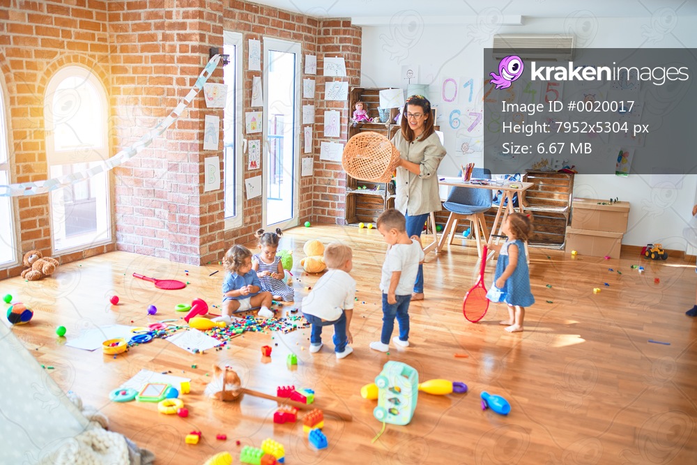 Beautiful teacher and group of toddlers playing around lots of toys at kindergarten