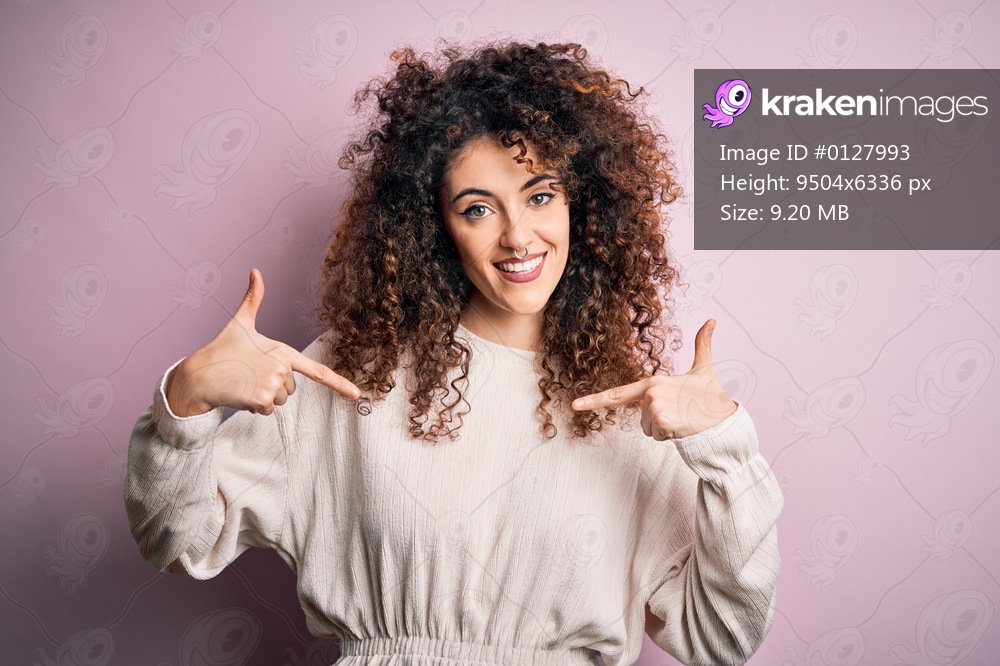 Beautiful woman with curly hair and piercing wearing casual sweater over pink background looking confident with smile on face, pointing oneself with fingers proud and happy. - Kraken Images